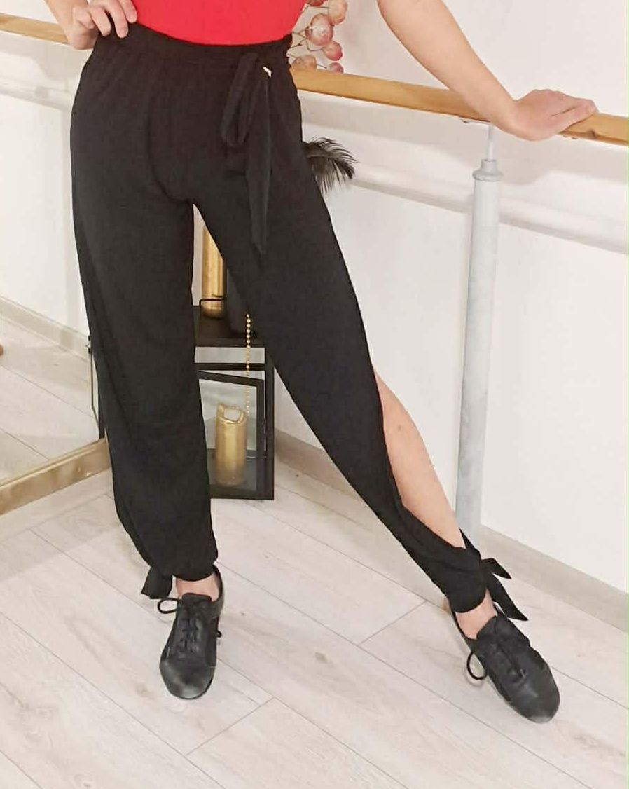 kényelmes ,szellős női nadrág,derekán gumis, oldalán combközépig felhasitott,bokán pánttal lehet összekötni ,standard táncokhoz ajánlott,vagy akár utcai viesletre is