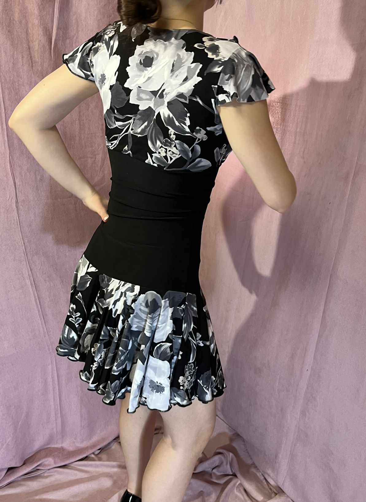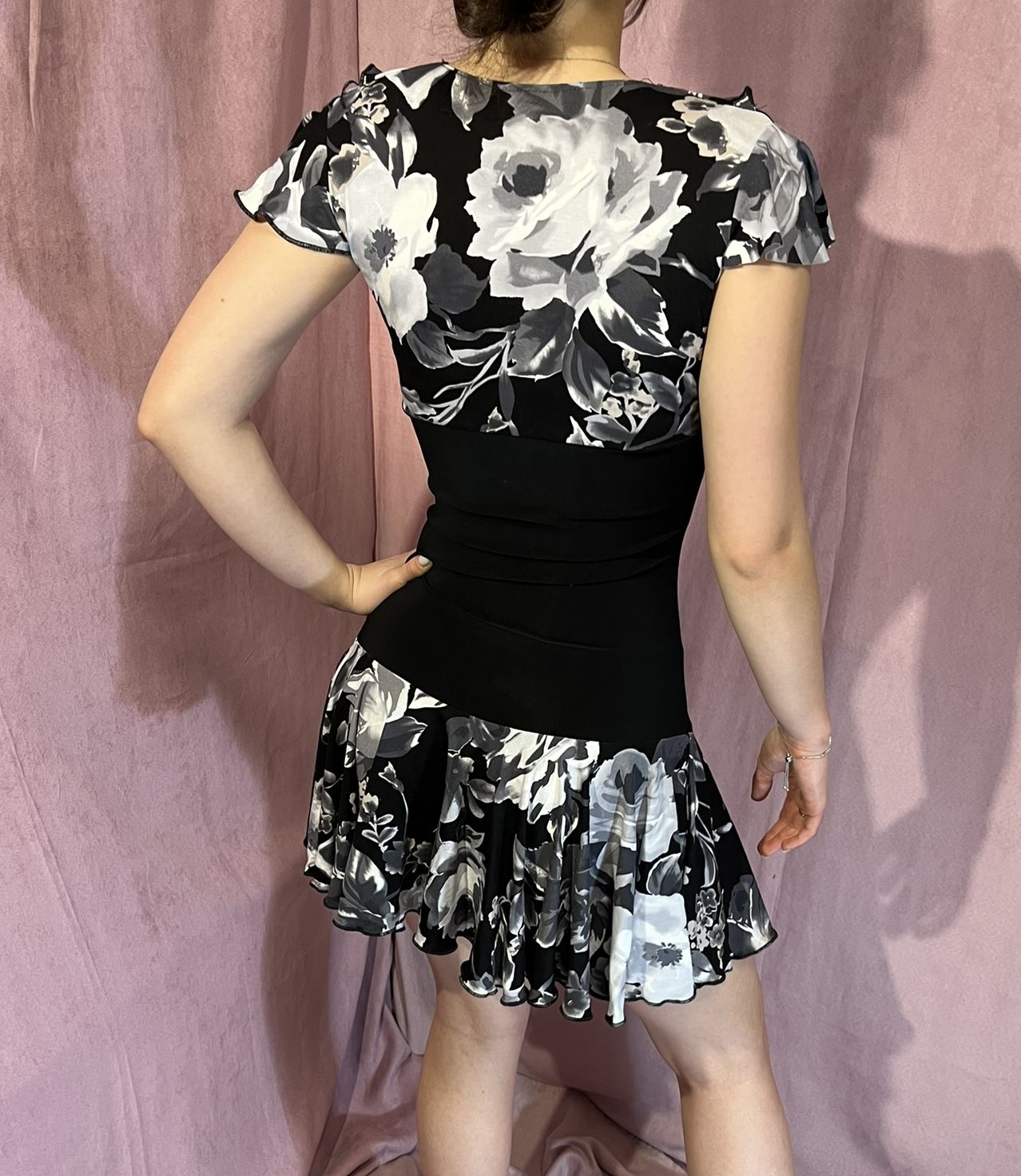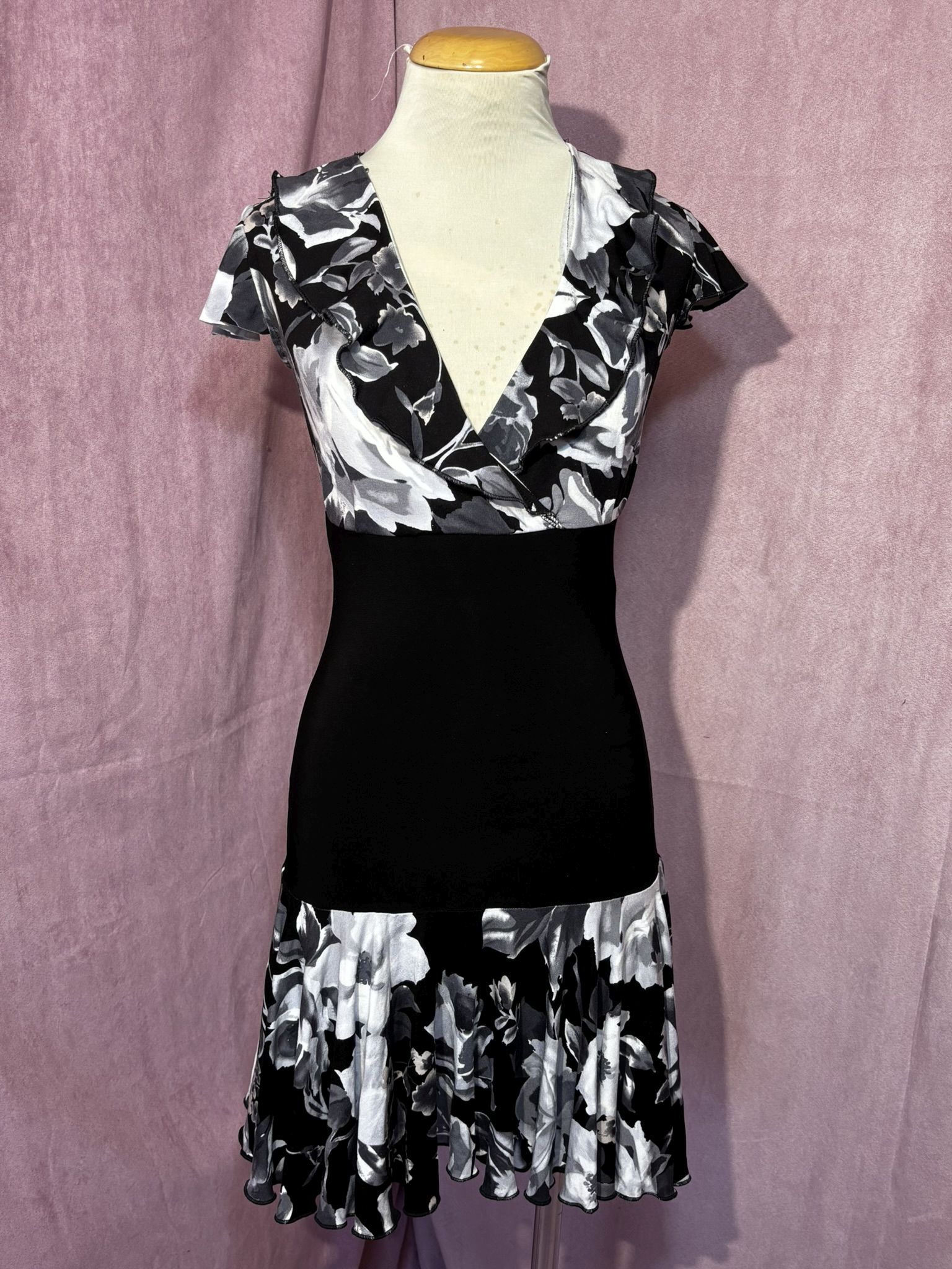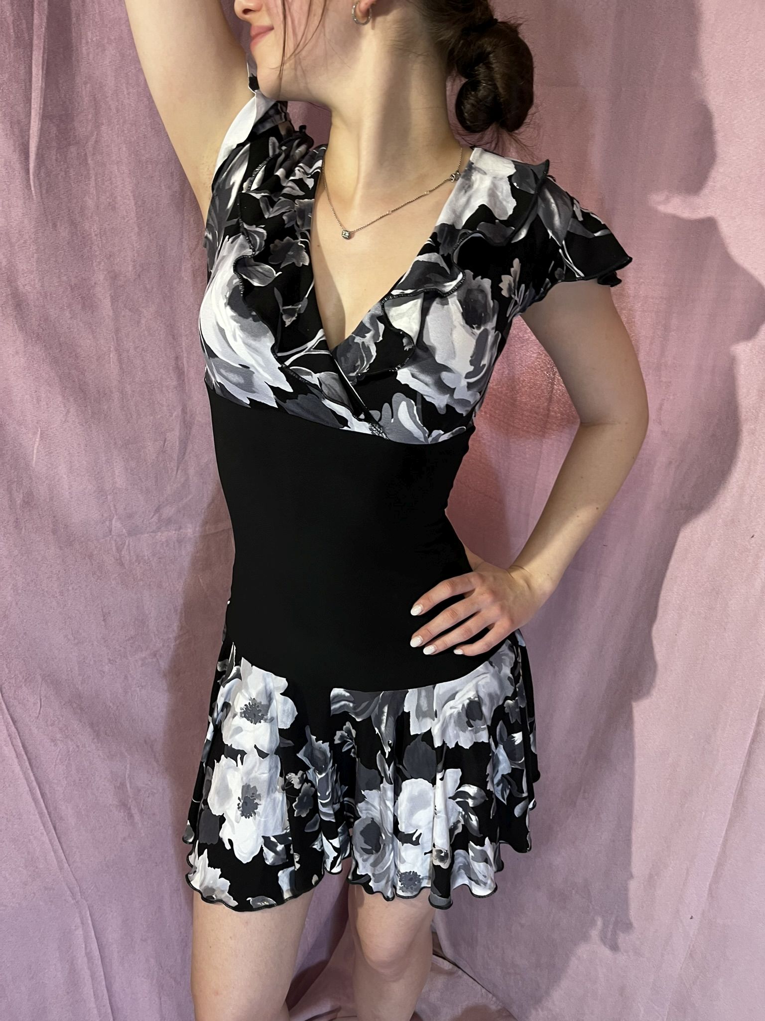 Elején V kivágású, fodorral záródó nyakkal, háta zárt, a szoknya része körloknis. Ideális társad latin tánc gyakorlása közben.