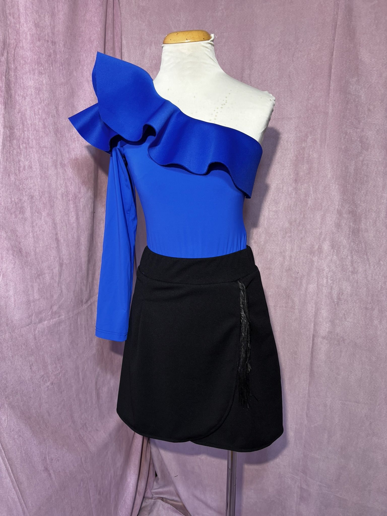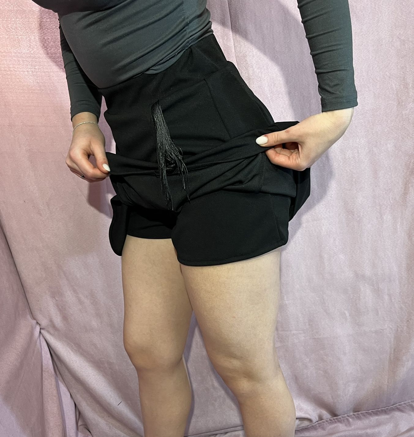 Latin gyakorló nadrágszoknya, belsejében rövidnadrággal varrva. Oldalán rojt díszítéssel