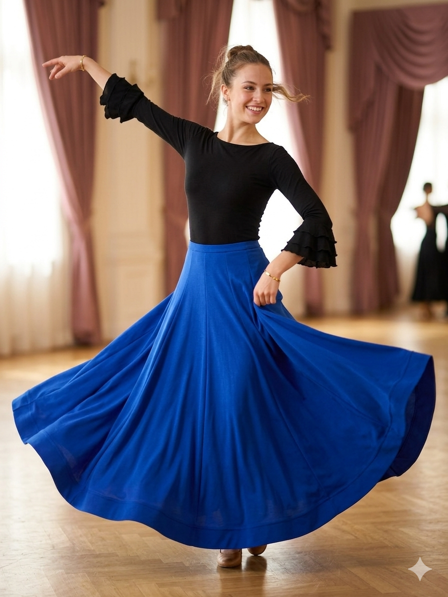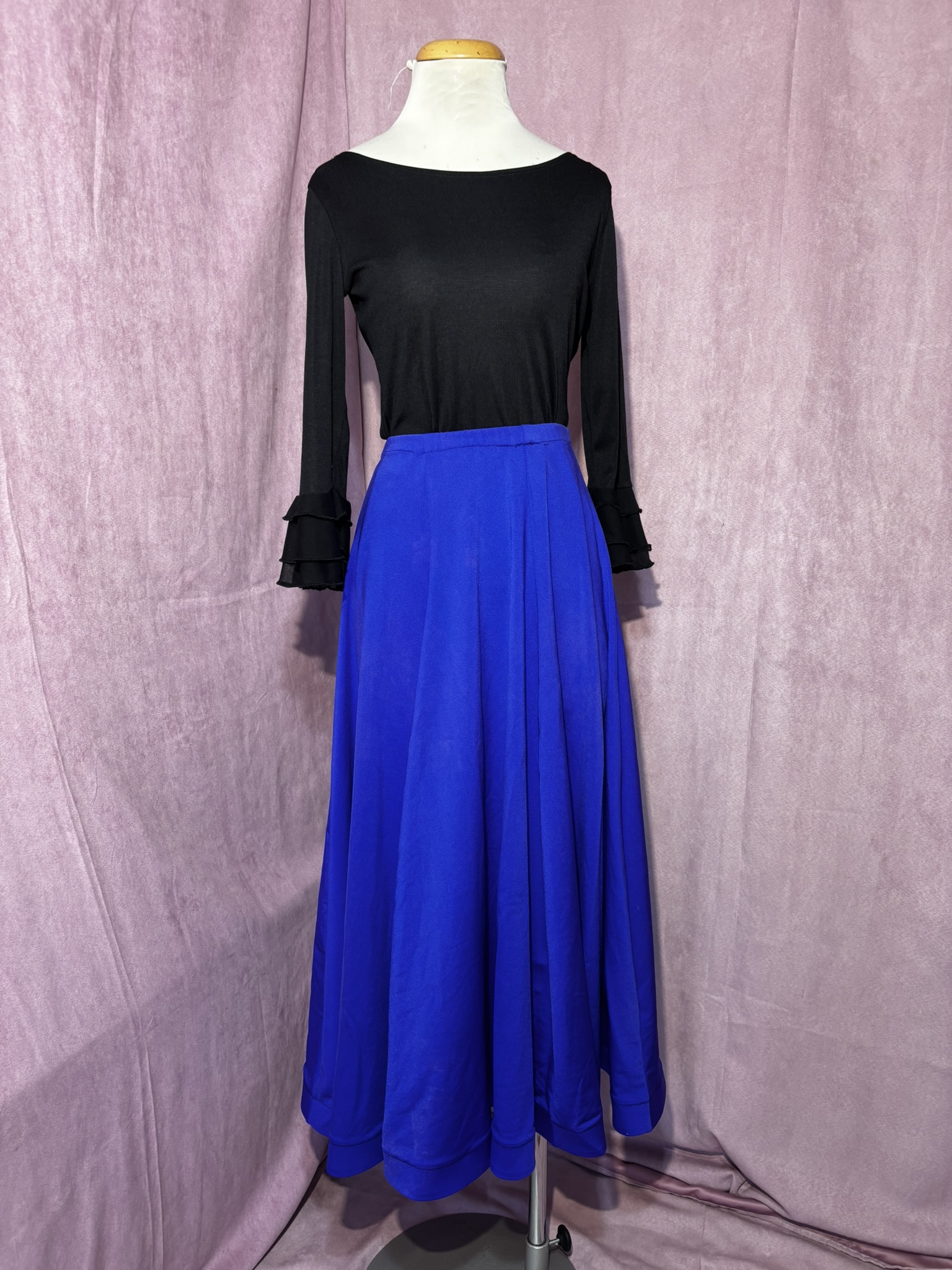 Hat részből szabott, derékban gumírozott, standard gyakorló szoknya alján lószőrrel szegve